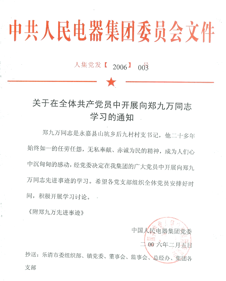 關于在全體共產黨員中開展向鄭九萬同志學習的通知